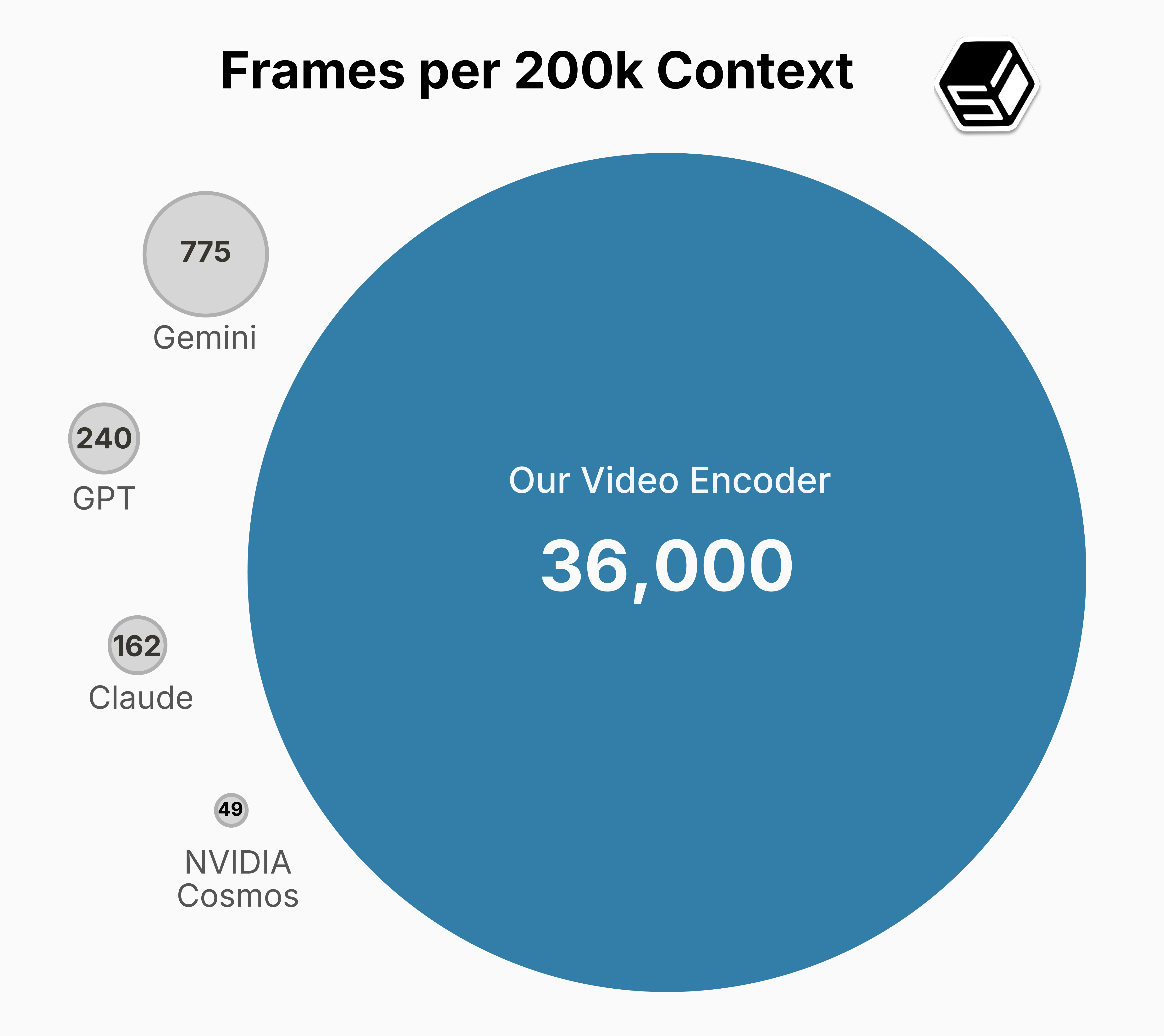 The missing piece was a video encoder. VLMs burn a million tokens to understand just one minute of 30 FPS computer data. Our video encoder encodes nearly 2 hours of video in the same number of tokens—50x more token-efficient than the previous state-of-the-art and 100x more token-efficient than OpenAI’s encoder. These improvements, in context length and dataset size, mean we can pretrain on enough video to finally scale computer action models.