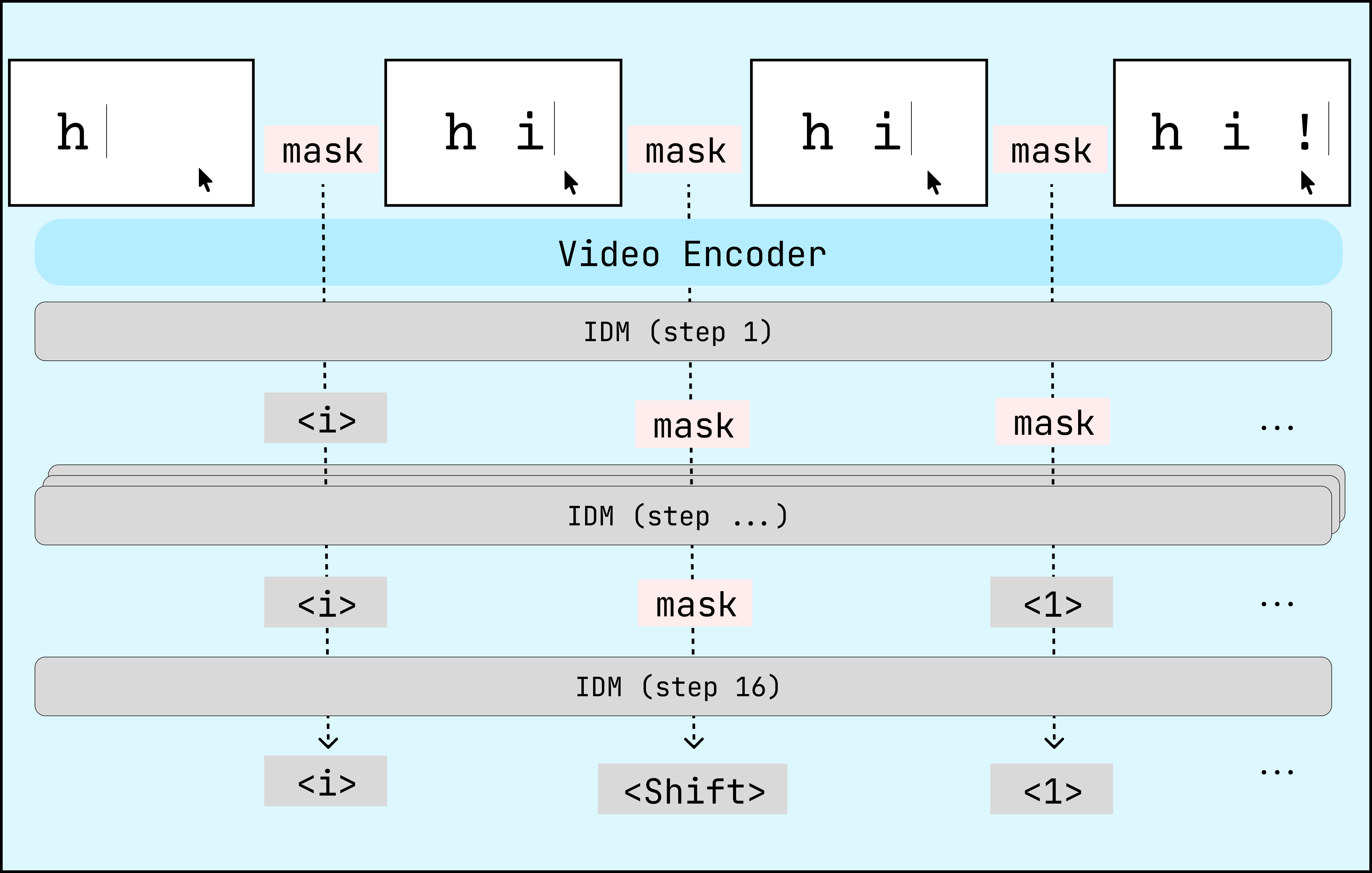 Labeling video is fundamentally non-causal—you can’t label a Cmd+C until you see the resulting pasted sequence. [6] 6. After experimenting with CTC loss as well as normal cross entropy for inverse dynamics modeling, a masked diffusion model performed best. To train a non-causal, generative model, we adopted a masked diffusion architecture. [7] 7. Generative modeling is important to scaffold the action space correctly. When using a non-causal cross-entropy metric, typos were extremely common.