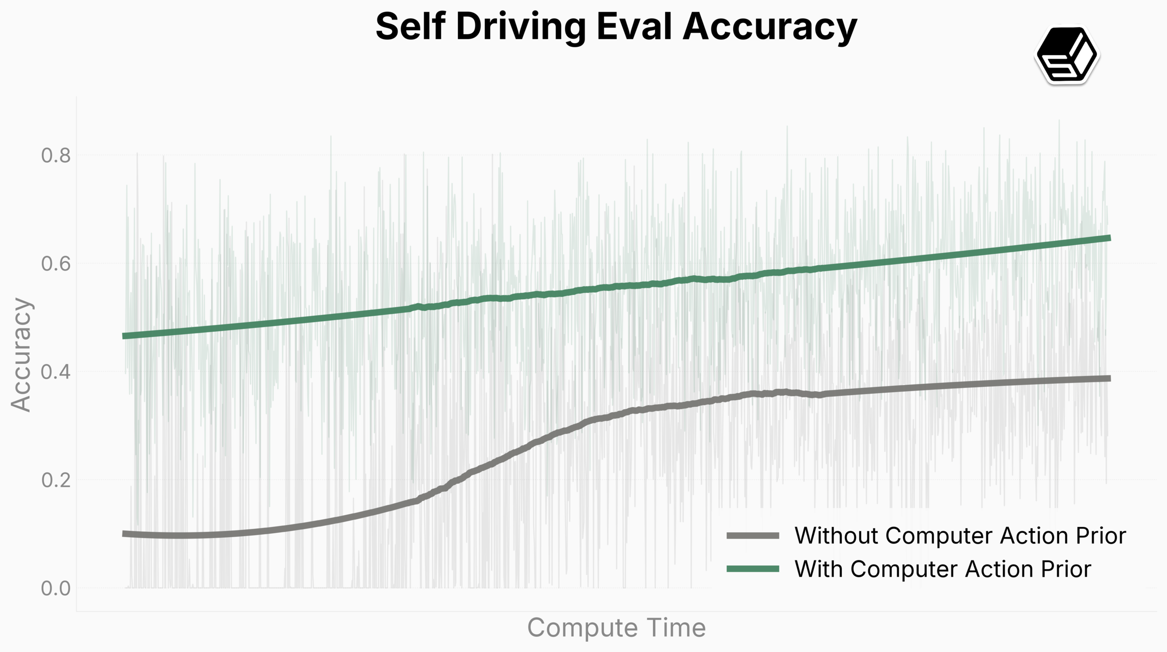 Our model successfully and scalably infers human behavior on complex tasks like object segmentation and 3D manipulation (See Blender usage in Figure ?). We also demonstrate that training on computer use generalizes to the real world significantly more easily than a model without such training. In our self-driving tests (Figure ?), the model is able to use a web interface to make turns around a block in San Francisco after finetuning on less than 1 hour of collected data. FDM-1 starts with 50% accuracy on keypress prediction (a choice between no action, move left, or move right; Figure ?), significantly higher than the baseline model with only our video encoder. Our model also achieves steeper scaling trends compared to the baseline. We expect to achieve zero shot performance on such tasks in the future.