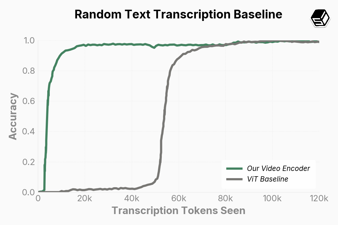 Comparing our video encoder to a standard ViT, we observe ~100x faster convergence during training (Figure ?).